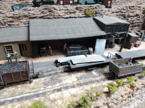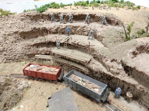 Is a "OO9" gauge layout setting the scene of a mining operation with a difference. They are mining raw corrugated iron from the ground and preparing into usable sheets of galvanised corrugated iron. The finished product is transported by rail and canal.